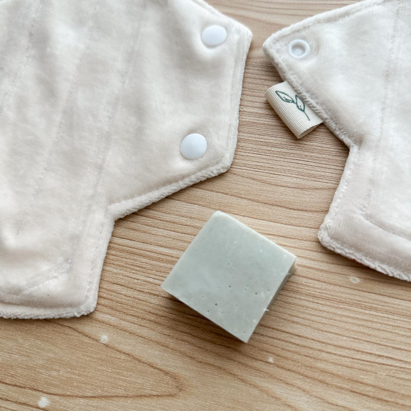 Salvaslip, compresa media y jabón para lavarlas.