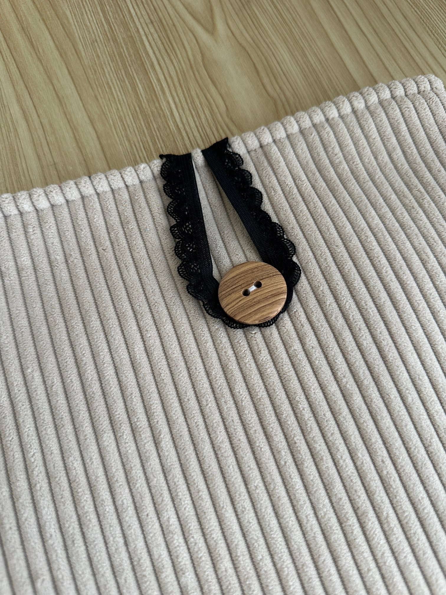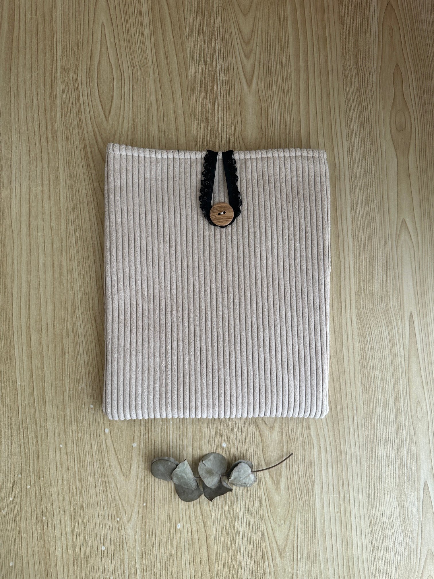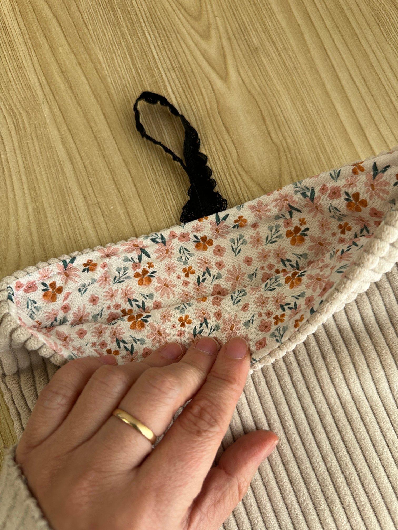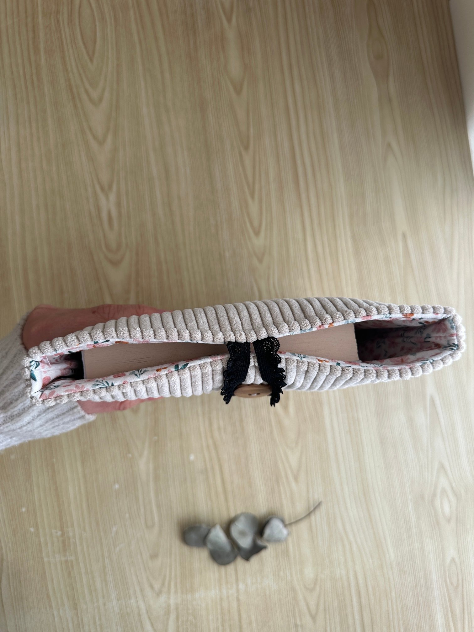 Funda de libro con el exterior de pana gruesa y el interior de algodón de flores combinado.