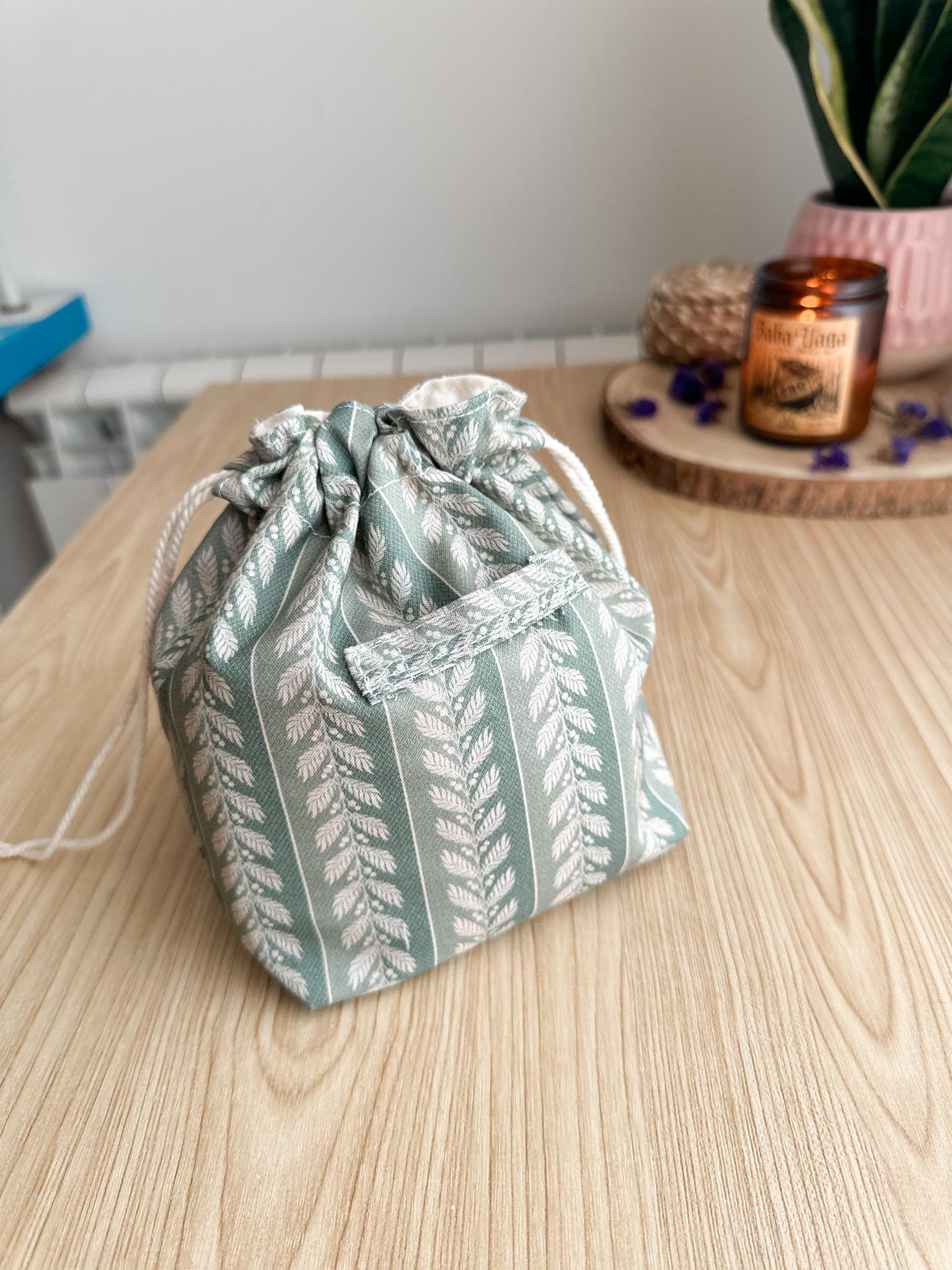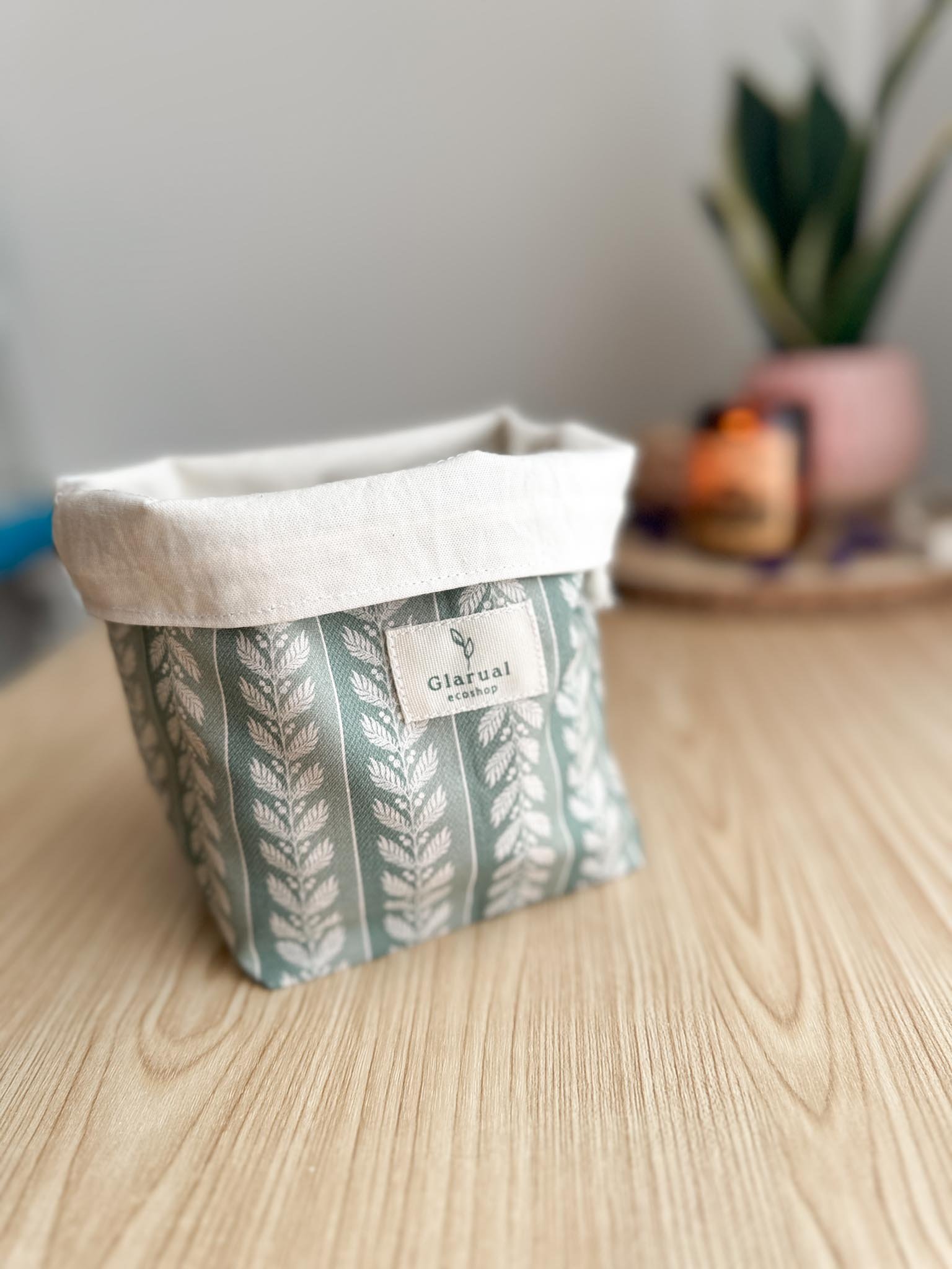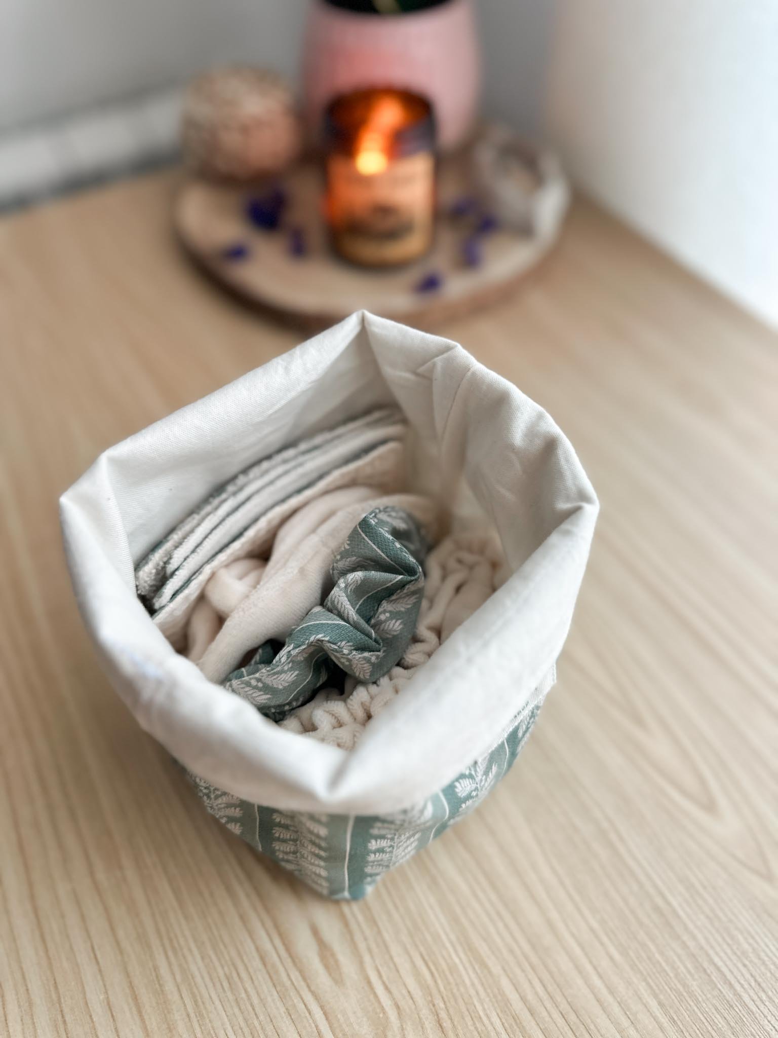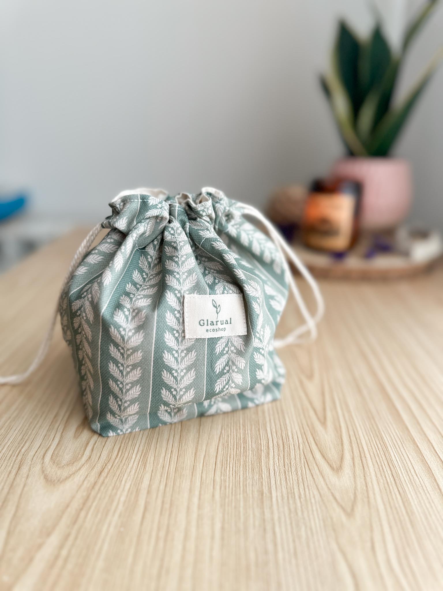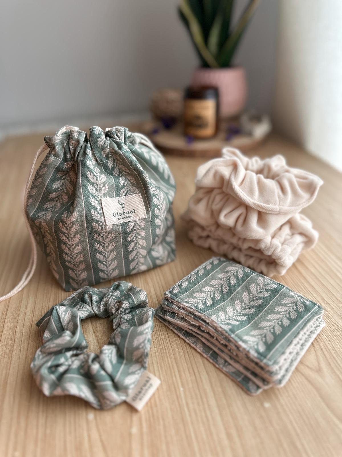 🌱 Bolsita de tela con asa convertible en cesta: La puedes usar como bolsita para guardar tus productos cerrados, o como cesta abierta en el cajón para tenerlos a mano. Tiene una cinta detrás para poder colgarla de un gancho si tienes poco espacio en el baño.
