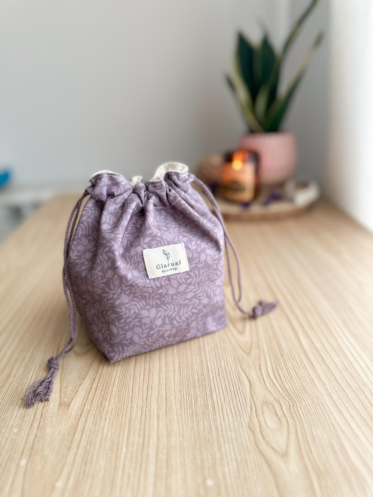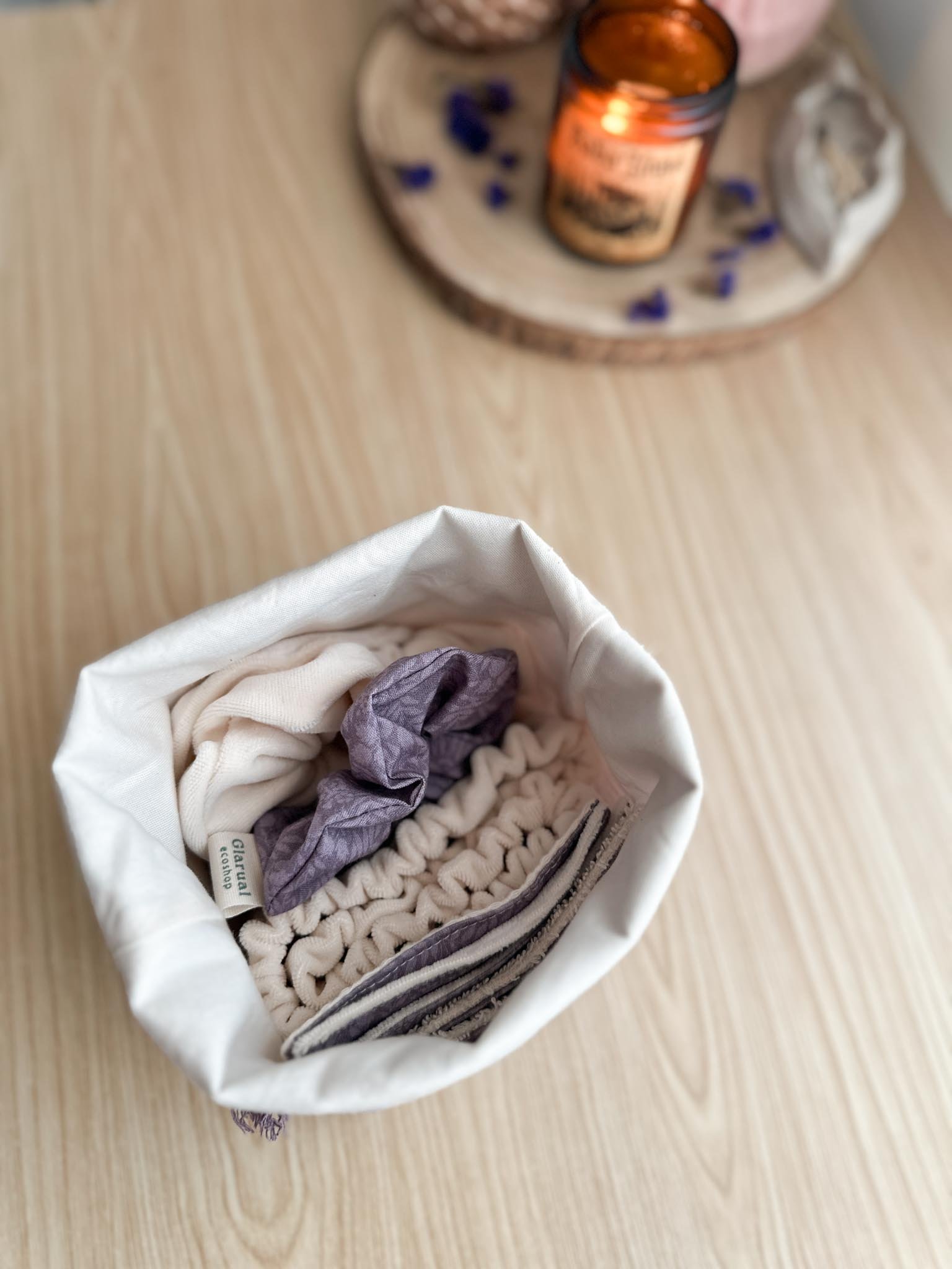 🌱 Bolsita de tela con asa convertible en cesta: La puedes usar como bolsita para guardar tus productos cerrados, o como cesta abierta en el cajón para tenerlos a mano. Tiene una cinta detrás para poder colgarla de un gancho si tienes poco espacio en el baño.