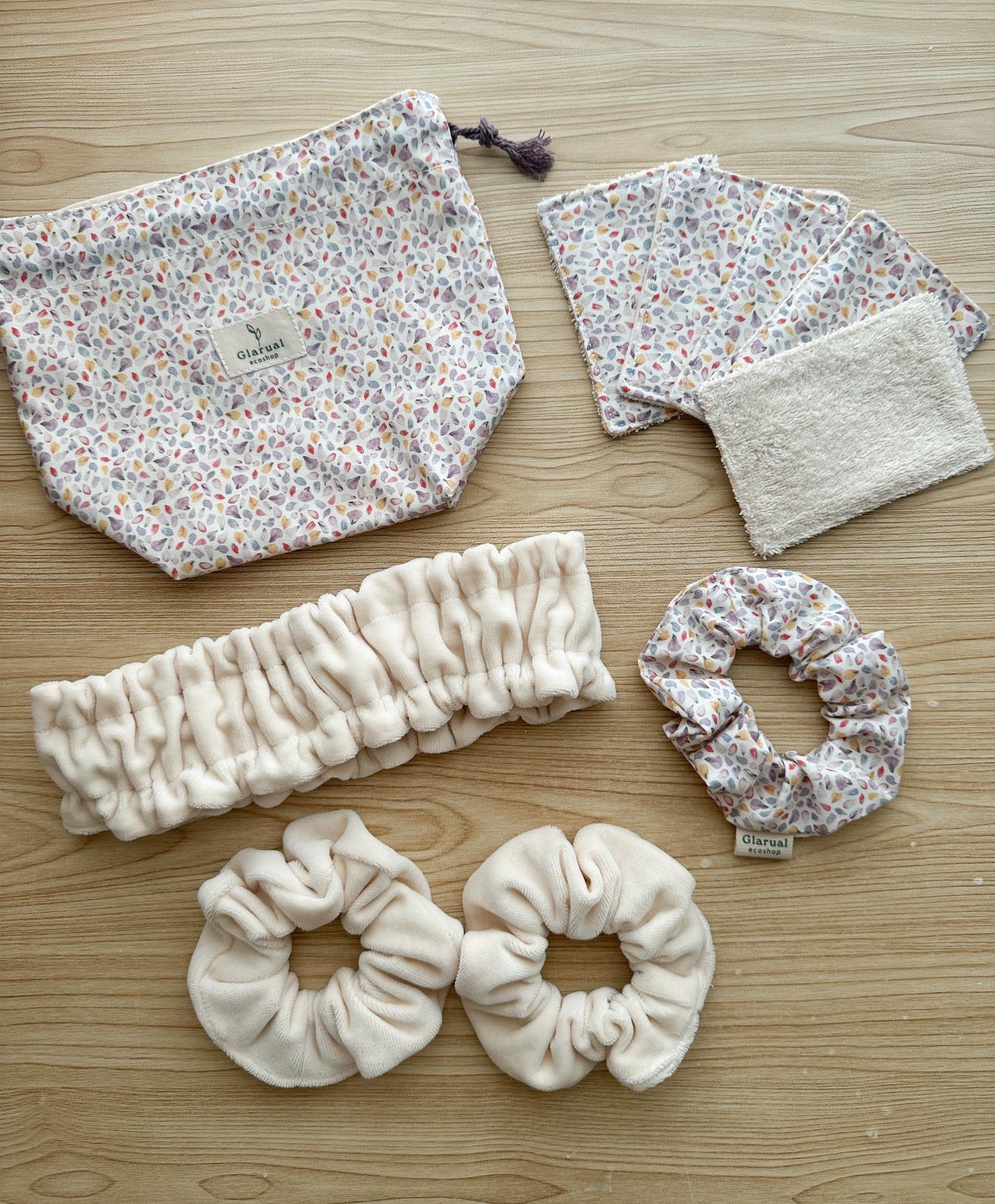 🌱 Diadema facial: la diadema más suave que te has puesto nunca. Hecha con la misma tela aterciopelada 100% de algodón con la que hago mis compresas de tela. Tiene tres canales con elásticos para que se adapte y se sujete perfectamente a tu cabeza. El pelo te quedará recogido, y si te llega algo de agua no hay problema porque tiene absorbente.