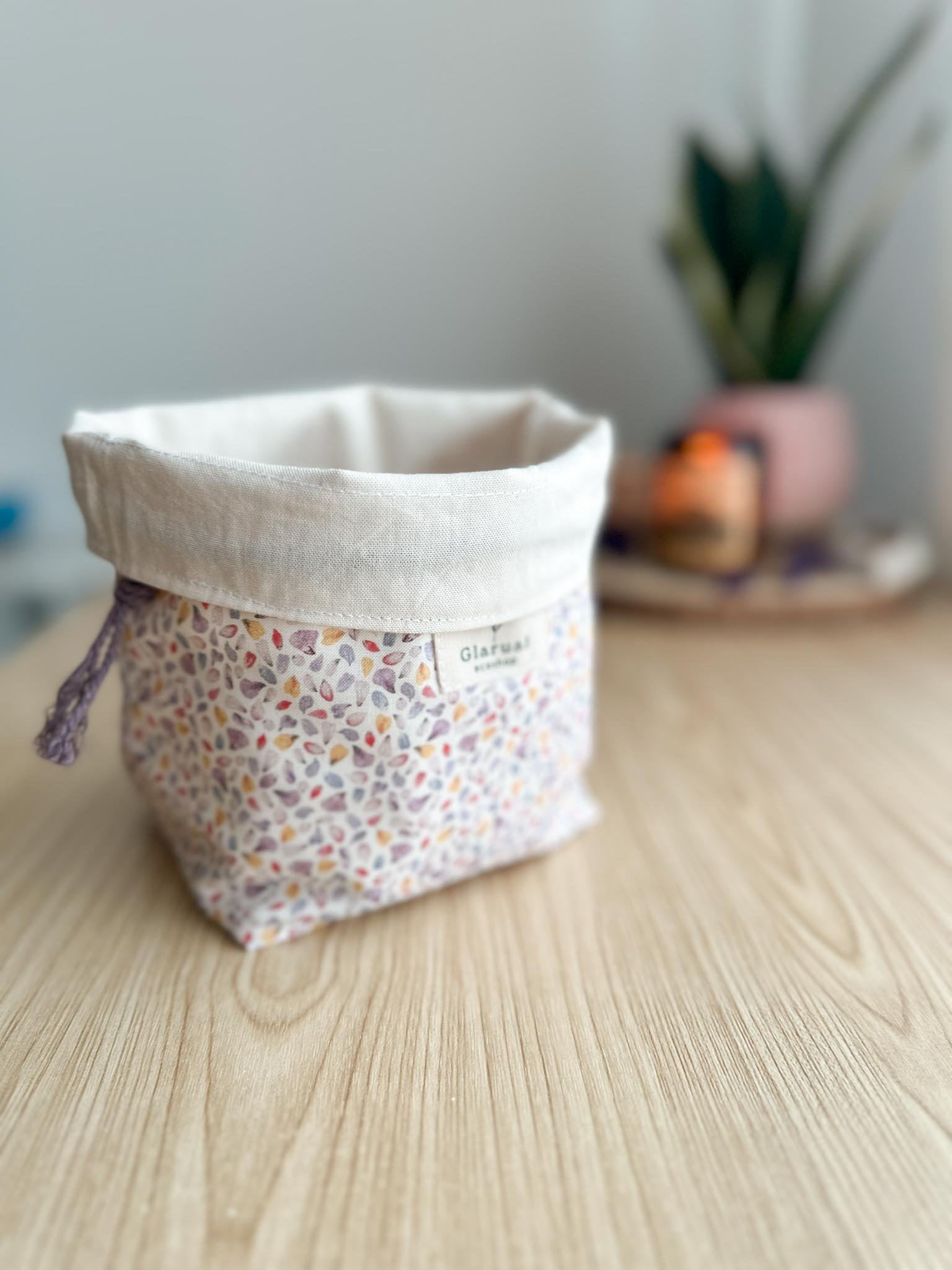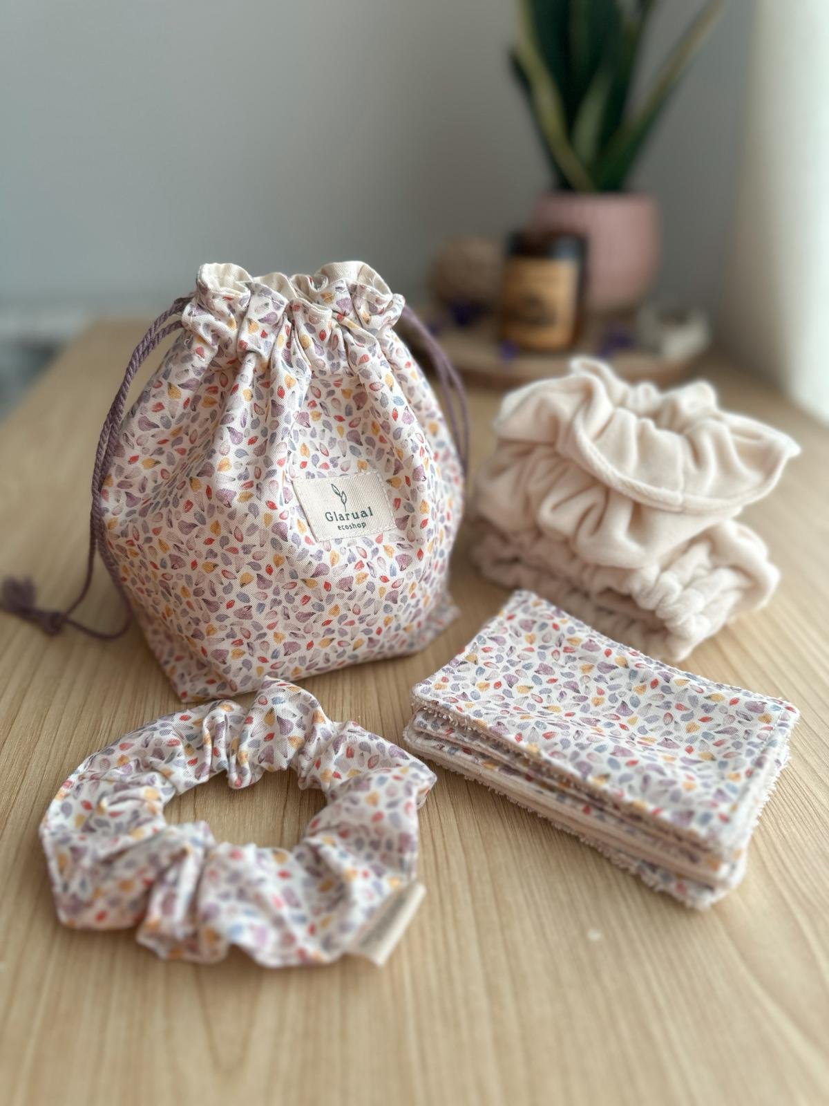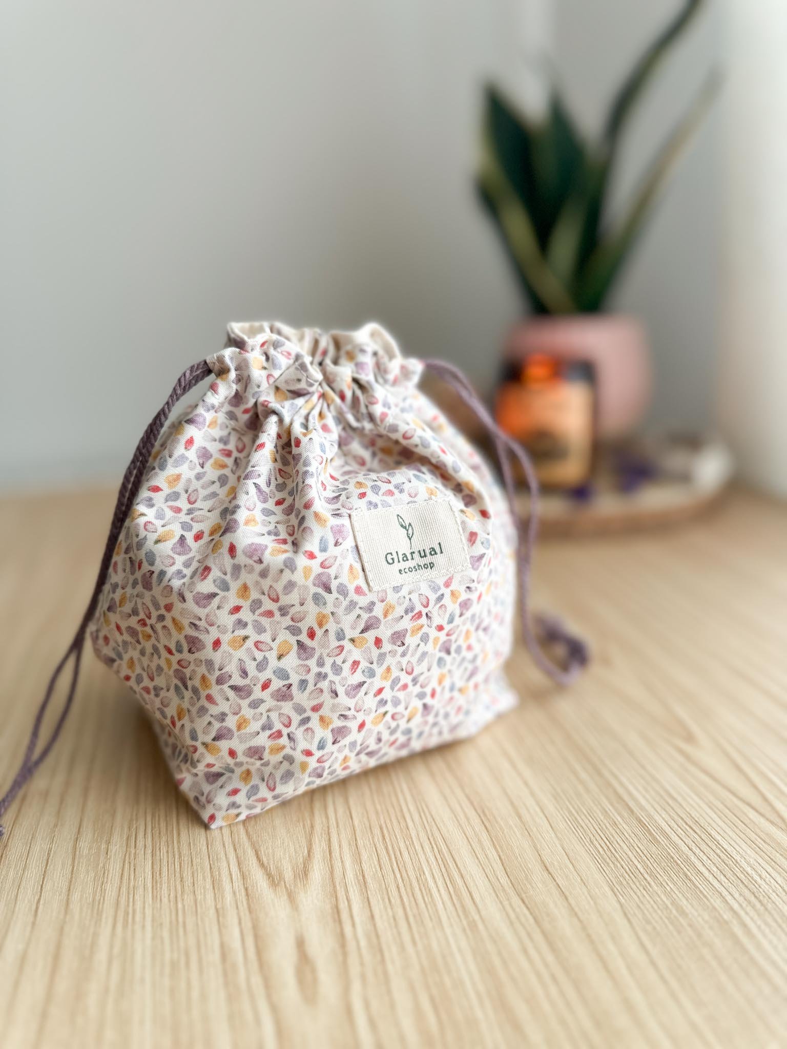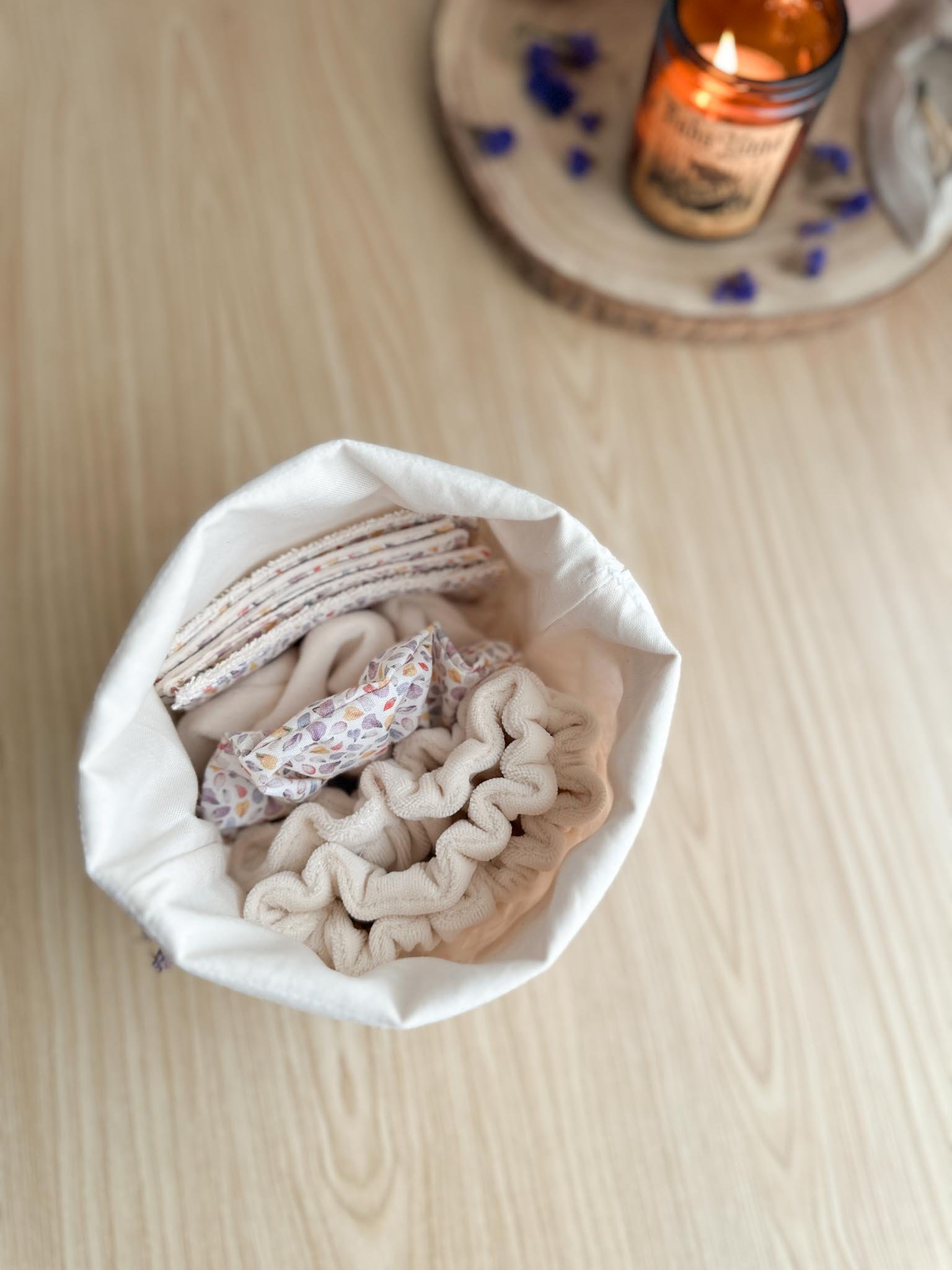 🌱 Bolsita de tela con asa convertible en cesta: La puedes usar como bolsita para guardar tus productos cerrados, o como cesta abierta en el cajón para tenerlos a mano. Tiene una cinta detrás para poder colgarla de un gancho si tienes poco espacio en el baño.