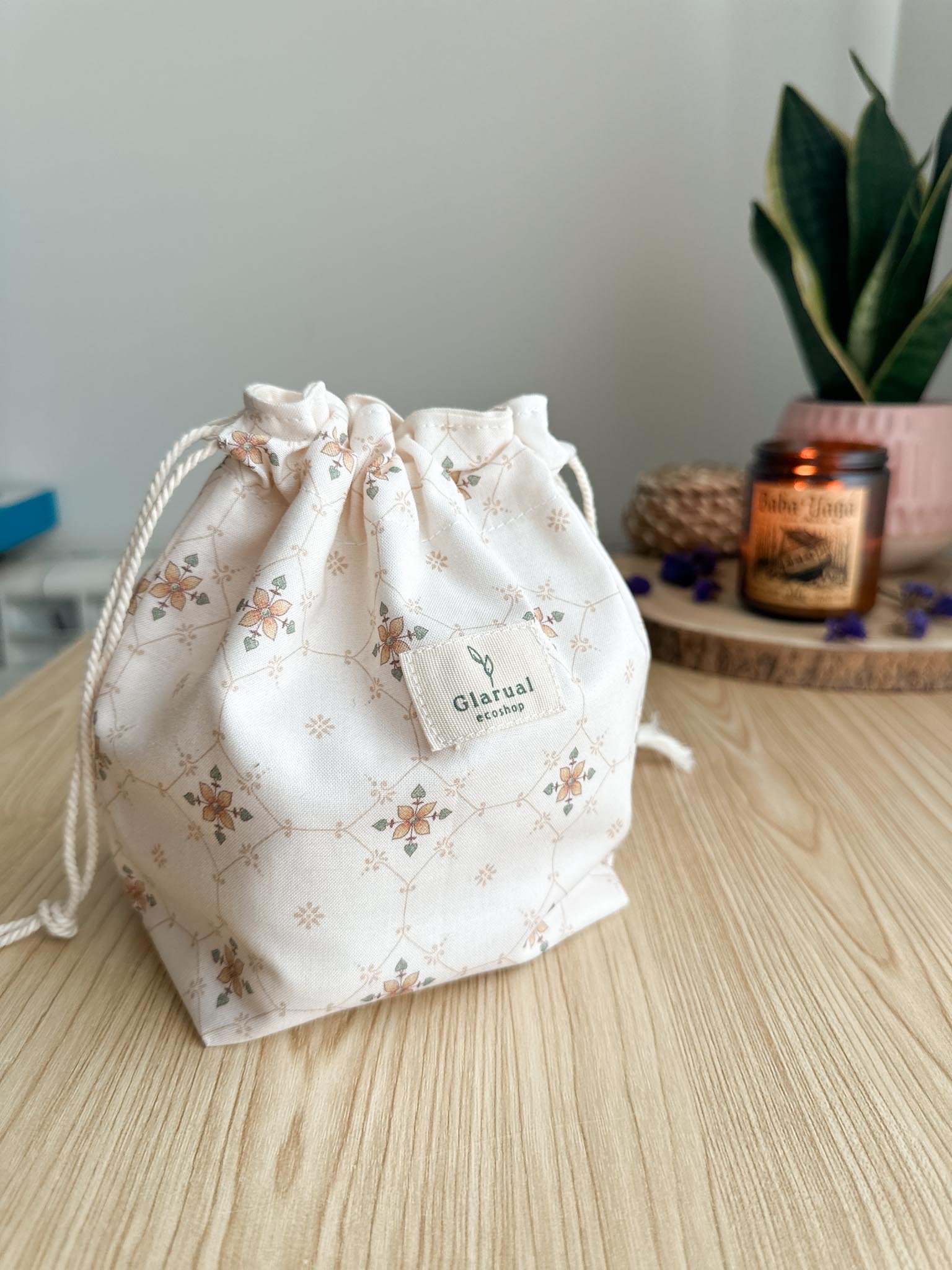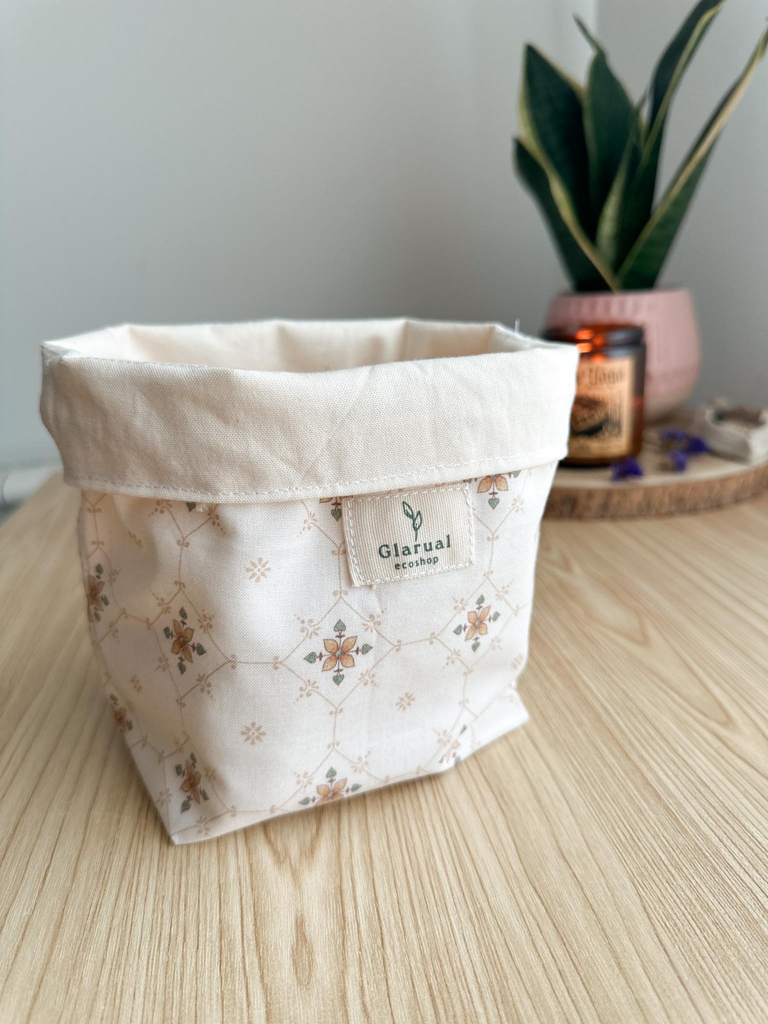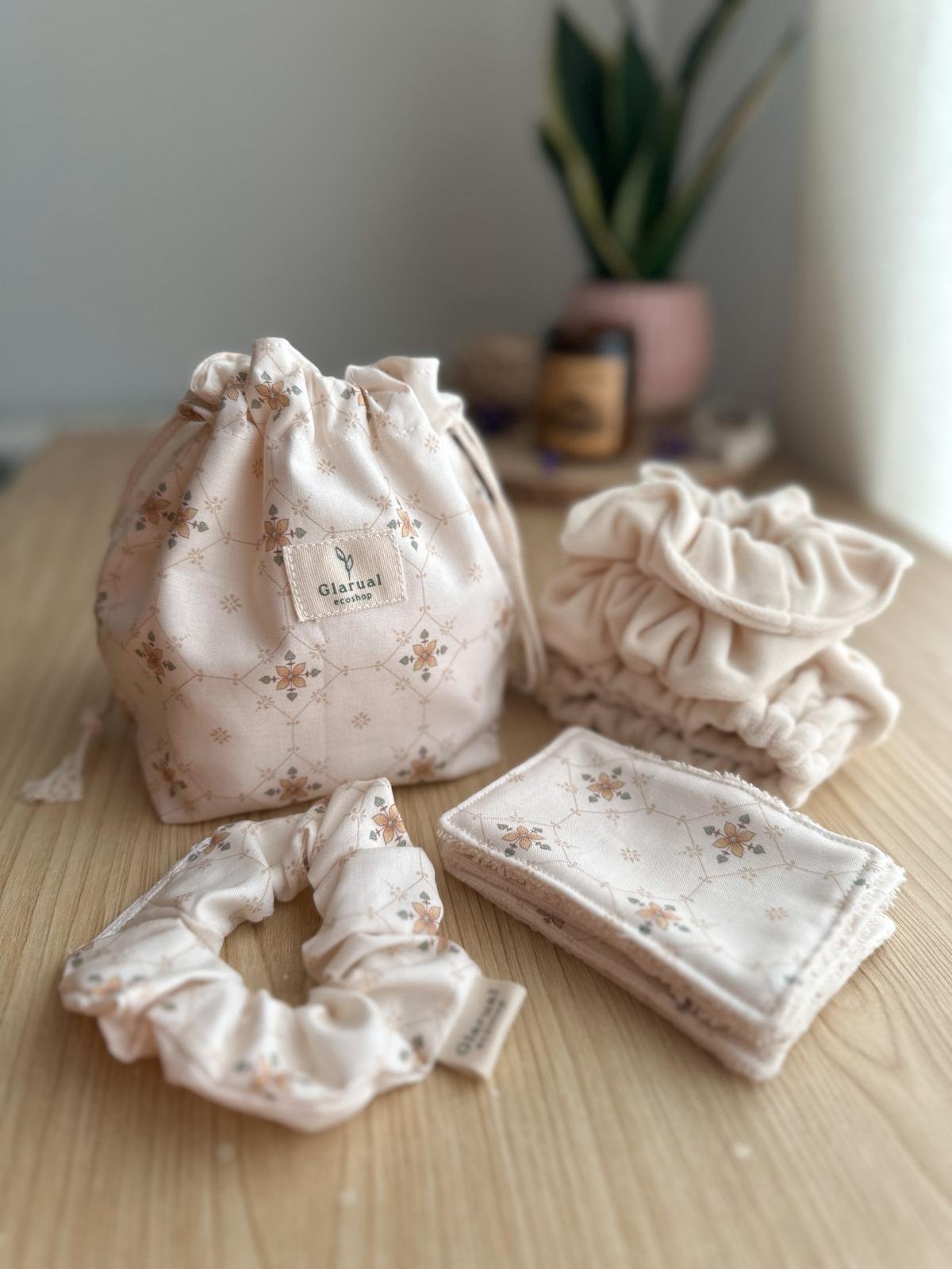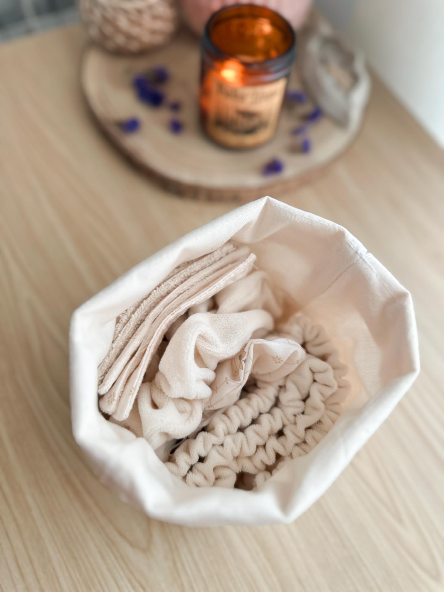 🌱 Bolsita de tela con asa convertible en cesta: La puedes usar como bolsita para guardar tus productos cerrados, o como cesta abierta en el cajón para tenerlos a mano. Tiene una cinta detrás para poder colgarla de un gancho si tienes poco espacio en el baño.